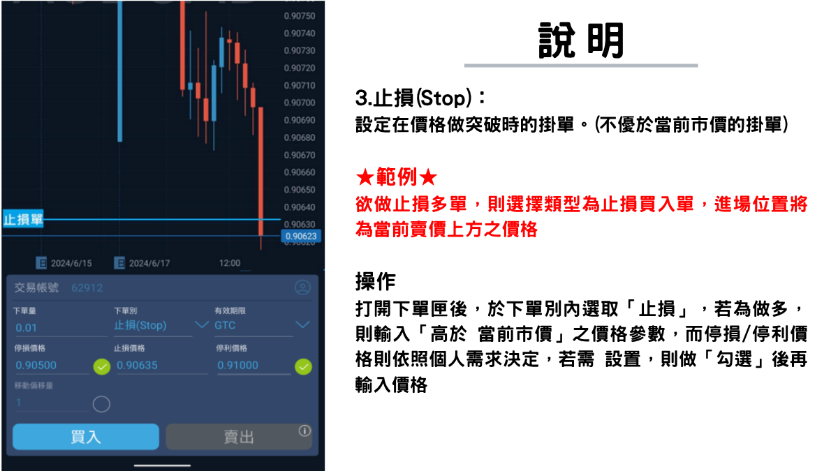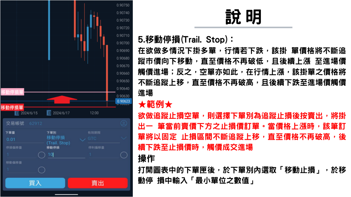 (2)下單別:有市價(Market)、 限價(Limit)、 止損(Stop) 、 止損 限價(Stoplimit)與移動停損(Trail. Stop) 等交易類型可供選擇。