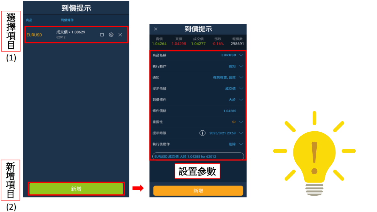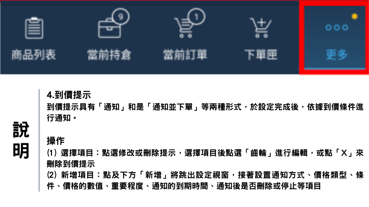 若設有到價提示,畫面左側會出現小鈴鐺,點擊警報 後,可編輯條件及觸價價格等設定。