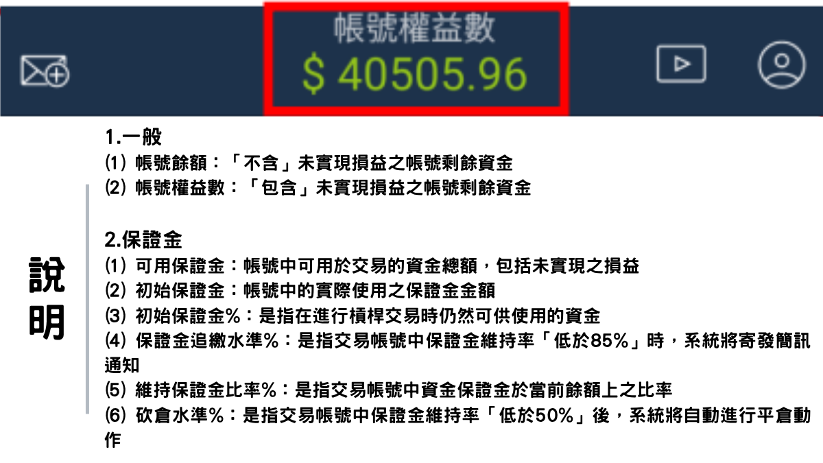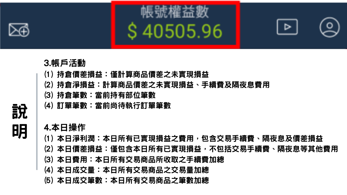 (4) 商品資訊:顯示該商品交易時段、隔夜息、交易限制等相關「商品資訊」。