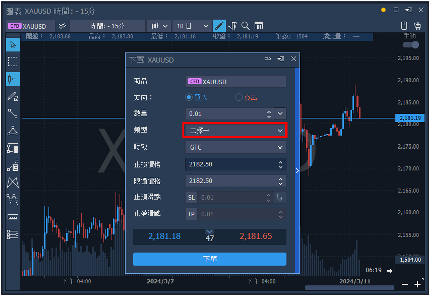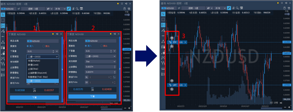 OCO單可以在下委託單時選擇或是在鼠標交易直接下OCO單