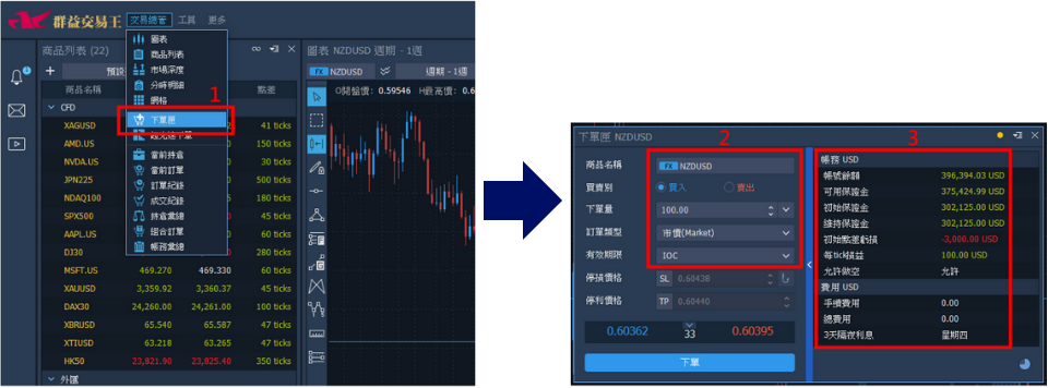 2. 選擇商品、買入或賣出、 下單量、委託單
