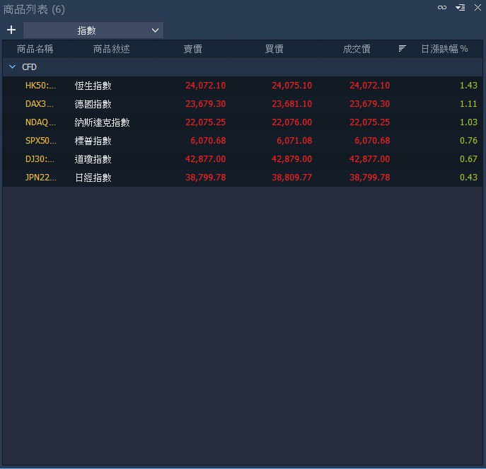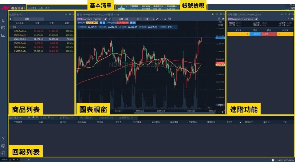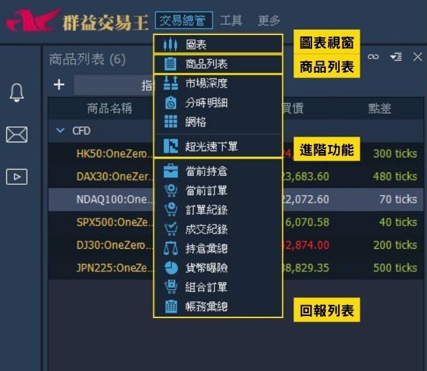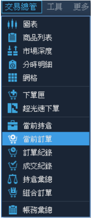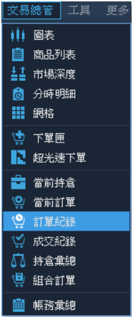 基本清單:圖表操作、商品列表、市場深度、分時明細、網格、下單匣、超光速下單、當前 持倉、當前訂單、訂單紀錄、成交紀錄、持倉彙總、組合訂單