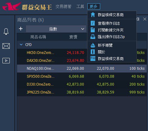 資訊項目:新聞資訊、RSS、經濟日曆、群益槓桿交易商、查看操作日誌、打開數據資料夾、匯出操作日誌 Zip、新手導覽、關於