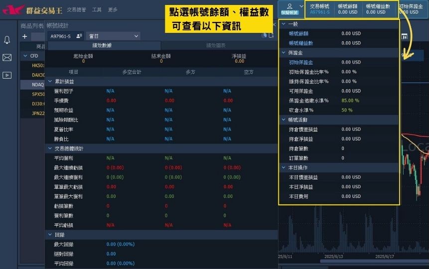 於群益交易王平台上方之交易帳號欄位,可見揭示的帳號各項績效資訊,如損益、盈虧比和勝 率等,無需再匯出即可查看;另外,點選【帳號餘額】與【帳號權益數】的區域,能查看當前帳號損益、風險、交易筆數等部位狀況。