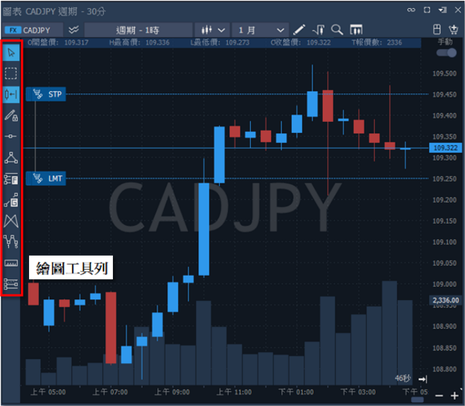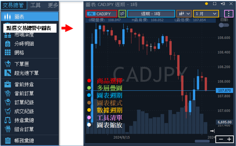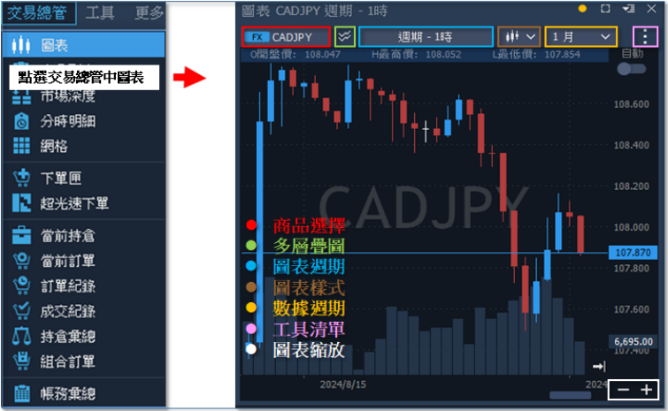 圖表視窗:圖表商品、交易帳號、多層疊圖、圖表週期、圖表樣式、數據週期、圖表縮放、 繪圖工具列、新增指標