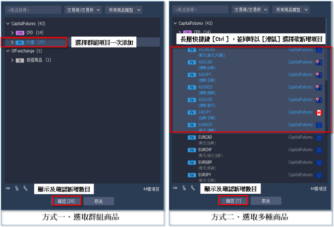 1. 商品選擇:由商品類群中選擇所要商品,點擊後該商品走勢將帶入圖表視窗中。