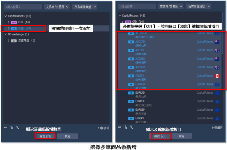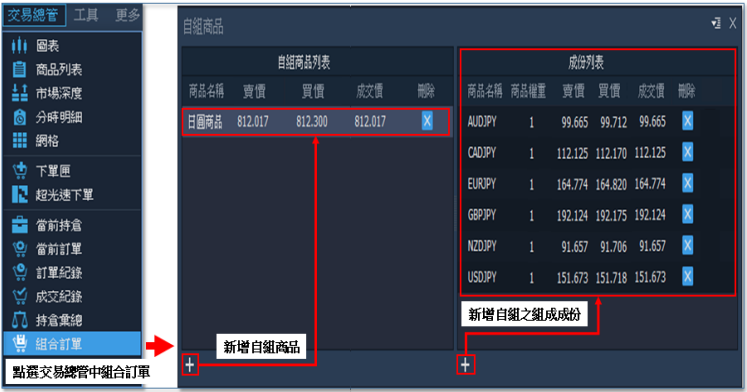 6. 自組商品:此功能能為自己獨家打造一個特別的個人化商品。您可將關注的商品自組成一種 商品新增至商品列表之中,以便行情來臨時,直接以此商品快速進行下單,同時買賣所選商 品。(註:組成之商品價格為所有所選商品之價格加總)