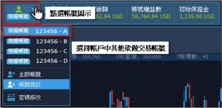 查看整體帳號狀況,至畫面中段點選【交易帳號、帳號餘額、帳號權益數與初始保證金】 之橫幅──顯示該帳號之淨值、保證金等相關資訊。若是要切換帳號,則點擊【模擬帳號】或 【真實帳號】,則可選擇清單裡頭其它帳號。