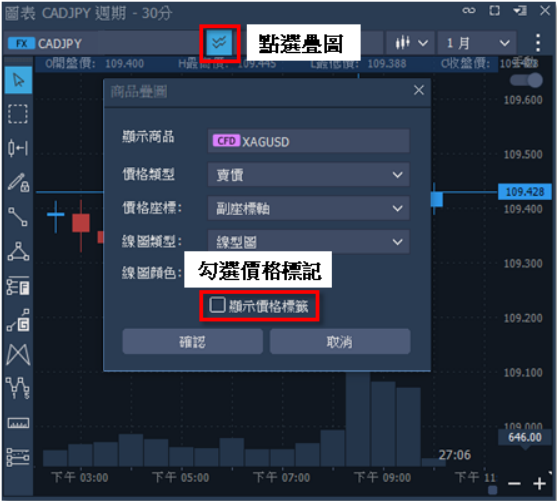 3. 疊圖項目:在開啟疊圖功能後,圖表左上會出現商品標籤,隨時可隱藏、關閉或調整。