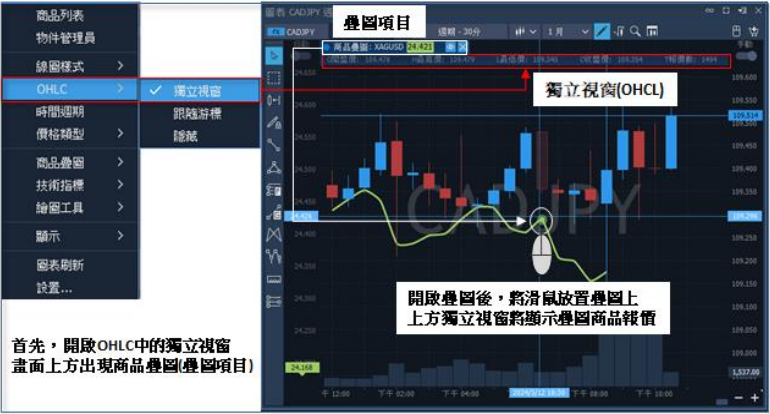 2. 勾選標籤:可將疊圖商品設為主要價格觀察對象,點選設定後,於圖表空白處右鍵點擊 【OHLC】中【獨立視窗】,畫面右上即會出現相關數據畫面,此時【游標】停留處,該 欄將顯示價格資訊。