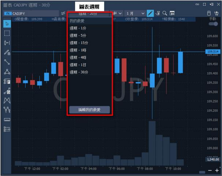 3. 圖表週期:有 1 分、5 分、15 分、1 時、4 時、1 日等週期可切換。