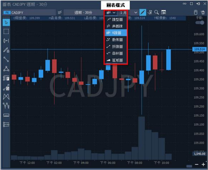4. 圖表樣式:有線型圖、美國線、散佈圖、K 線圖、森林圖、區域圖等圖表樣式可切換。