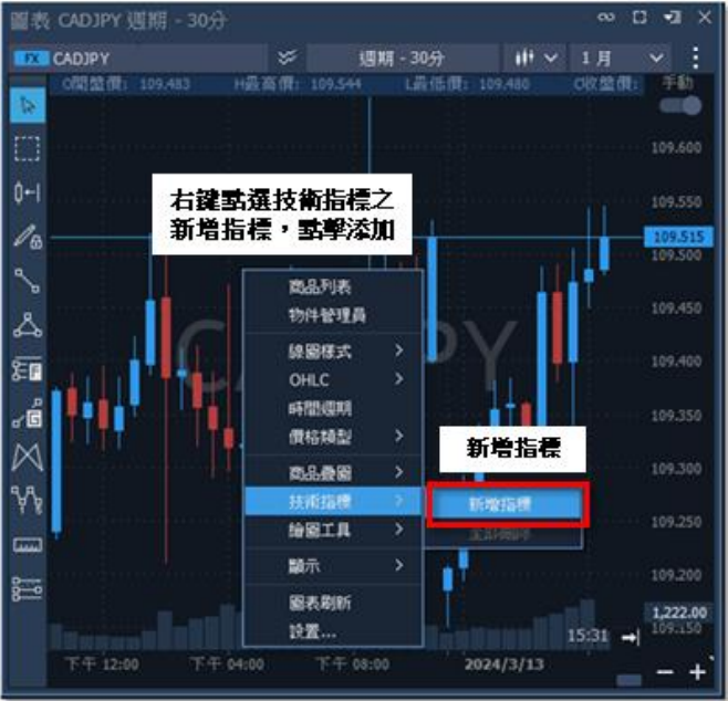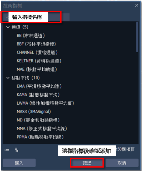 於圖表點擊右鍵後,選取【技術指標】中的【新增指標】,會出現指標視窗的畫面可做選 擇,點擊完新增指標,圖表畫面將出現該指標。欲變更參數,可至指標頁籤點擊可進行編 輯;欲刪除,對圖表點擊右鍵,選取【技術指標】中的【全部刪除】。 1. 圖表右鍵:於圖表中右鍵清單,選取【技術指標】中的【新增指標】。 2. 選擇指標:於指標視窗上方輸入指標名稱,或由下方折疊欄位中找尋,並做點選確認。 3. 指標編輯:在指標點選完畢後,圖表中將出現指標頁籤及指標,可點頁籤,修改參數。