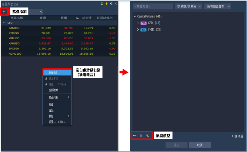 除查看各類商品,亦可進行下單動作──於【商品列表】視窗內點擊欲下單商品進行下單。 1. 點選添加:點擊視窗左上【+】,或於商品列表空曠處【右鍵】─新增產品。 2. 選擇商品:點擊添加後,視窗將出現所有商品,於左下角選擇【展開類型】,調適成適合閱 覽的畫面做選取新增。