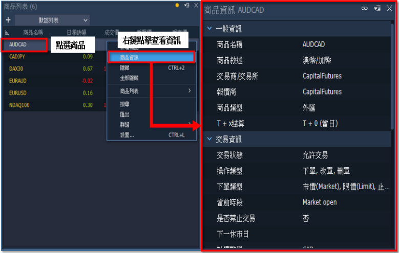 欲查看商品相關資訊,選擇【商品資訊】,可見商品資訊,如:合約規格、交易類型等。