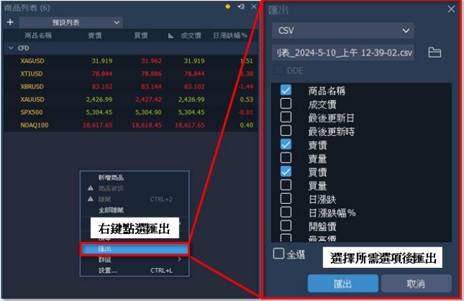 2. 匯出:於匯出視窗中勾選所需項目後,點擊【匯出】儲存。