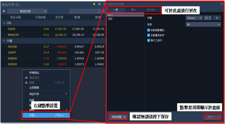 2. 頁籤:選擇【一般】頁籤,可進行顏色調控。若要增加觀察項目,至頁籤【欄位】調整,有 商品、漲跌幅、買價、賣價等基礎設置,以及【成交量】和【點差】等非原廠設置可做新 增。