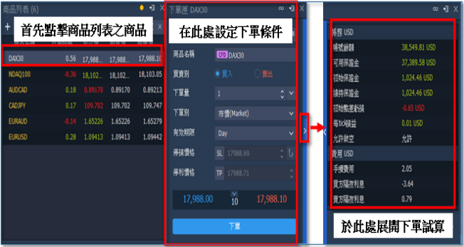 由商品列表處點擊商品後,跳出下單匣視窗,輸入設定條件後,點擊右側【>】──展開下單試 算資訊,即可見預期結果。