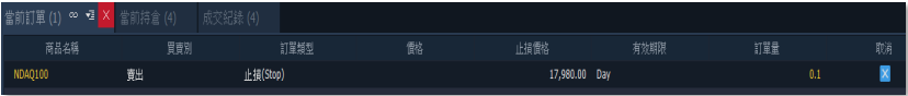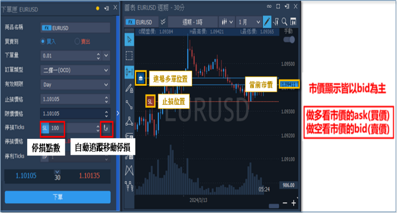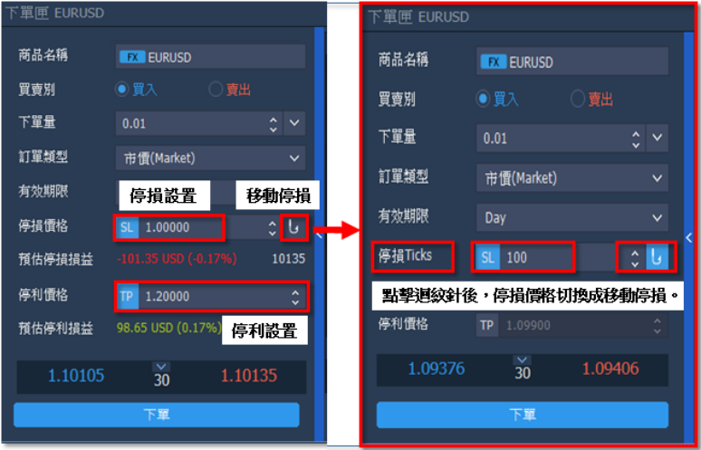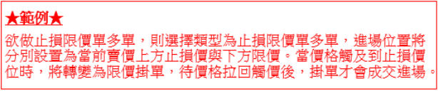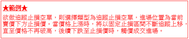 2.移動停損:於下單階段,利用該功能讓未來獲利後可自動去移動停損位,以保留獲利。 多單情況下,上漲時自動移動停損,下跌時不進行移停損,直至觸價停損出場。