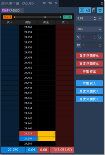 5. 超光速下單:開啟此視窗後,於畫面右上方可選擇四種能開啟的功能,為顯示/隱藏點差、 置中、滑鼠交易、顯示/隱藏下單匣等,主要針對畫面報價進行下單所用;若要查看買賣商品的 均價、持倉數量、淨損益,亦可由視窗下方顯示即時了解持倉狀況。