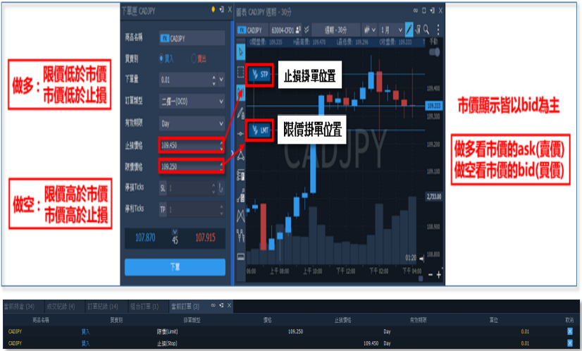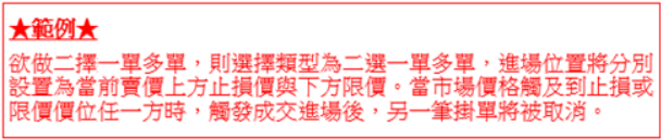 3.OCO 下單:因無法預期行情走勢是否先突破,還是拉回再突破,可以使用該類型,先設置兩 種限價位,一旦行情突破其中一種價格後進場,同時清除另一筆掛單,此機制可以在預期行情 走某個方向,但不確定是否直接突破,或拉回一段後再突破時設置。