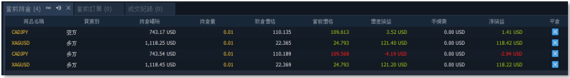 欲查看持倉商品相關資訊,至交易總管選擇【當前持倉】,畫面底部會出現當前持倉視窗,可進 行修改、查看與平倉。