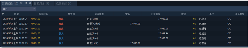 欲查看訂單或成交相關資訊,至交易總管選擇【訂單紀錄】,畫面底部會出現訂單記錄視窗, 可查看執行的商品、時間、價格等資訊。
