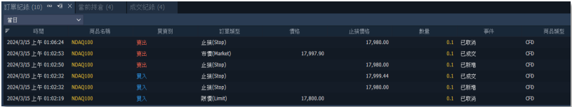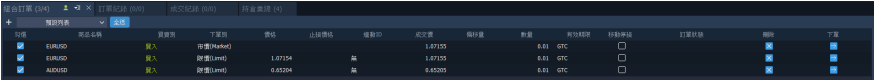 回報列表:預設分頁包含當前持倉、當前訂單、訂單紀錄、成交紀錄,若要檢視其他分頁,可至【交易總管】回報列表中將其分別開啟,查看其他回報資訊。