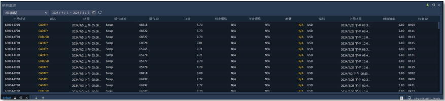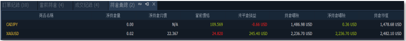 欲查看持倉彙總相關資訊,至交易總管選擇【持倉彙總】,畫面底部會出現持倉彙總視窗,可 查看持倉商品的整體對應貨幣兌之名目本金資訊。