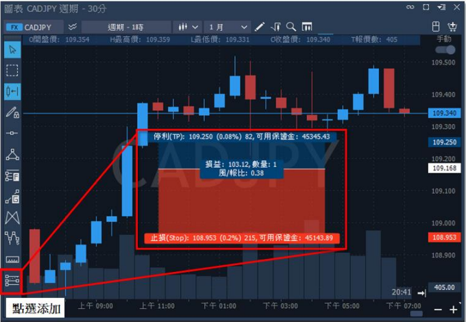 2.多空風報比:依照預期下單位置放置該工具,可查看盈虧比比例及預估損益,亦可調整大 小、距離,完成後欲做下單動作,點擊中間下單選項,將會把設置參數下單至所選價位上。