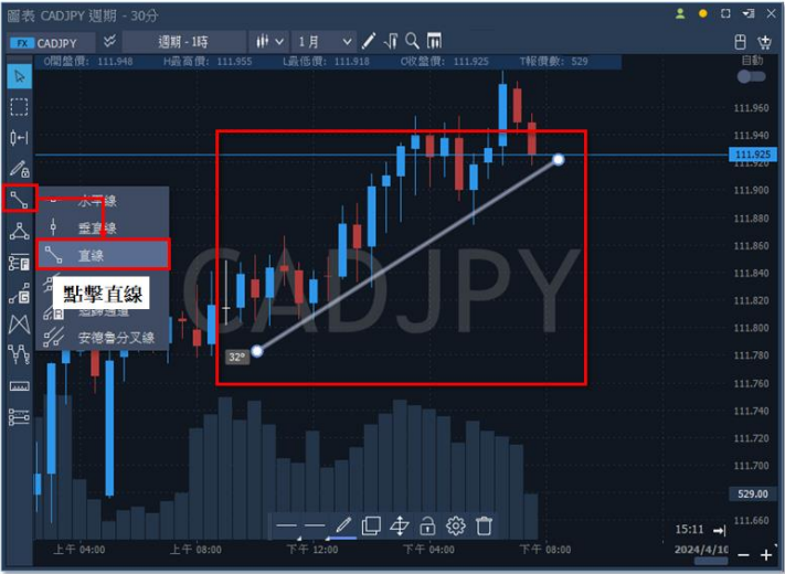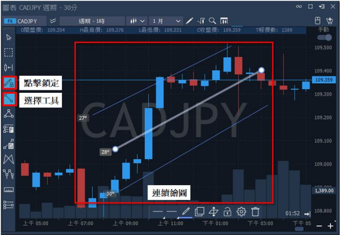 3.斜率計算:對於以動能判斷為依據的交易者執行操作者,在使用斜線工具前,先開啟【直 線】工具,才能進行繪製。繪製完成後,斜率將顯示在線圖左下方。