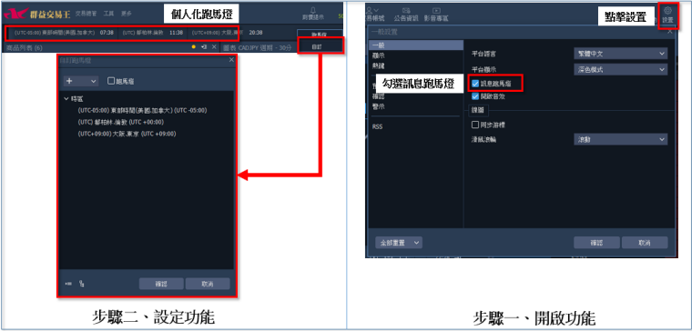 1. 個人化跑馬燈:可依個人喜好,把帳號資訊、商品或各國時間放在平台頂端畫面以跑馬燈方 式顯示所選項目。