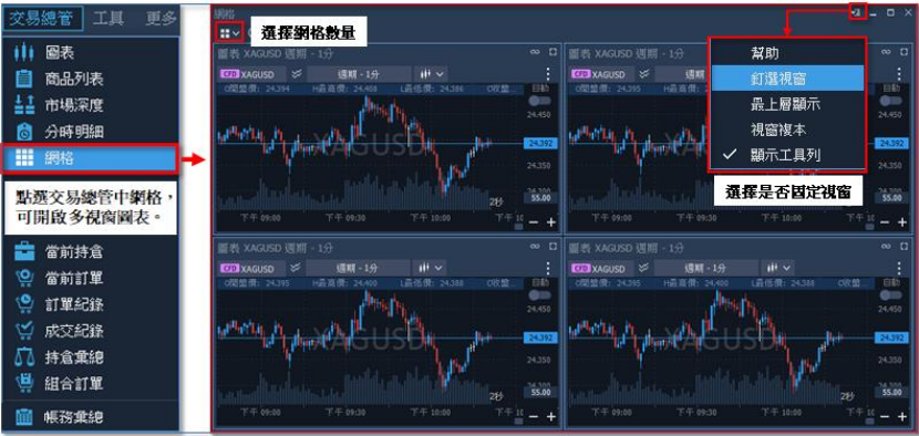 2. 網格:該功能為開啟多張圖表所用,點選後開啟獨立視窗,您可在此執行任何單獨圖表中所 能進行的各種操作;另外,如果不想以單獨視窗顯示,也可將畫面釘選在平台視窗中,只需選 擇視窗右上方【更多操作】中的釘選視窗,便能將畫面以頁籤形式放置在平台中。