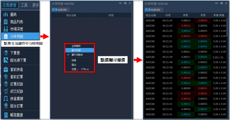 3. 分時明細:該功能為顯示商品逐筆報價資訊。欲開啟報價,須先以右鍵開啟清單,選則【顯 示報價】,畫面才會出現逐筆報價的時間、買賣價、交易量。