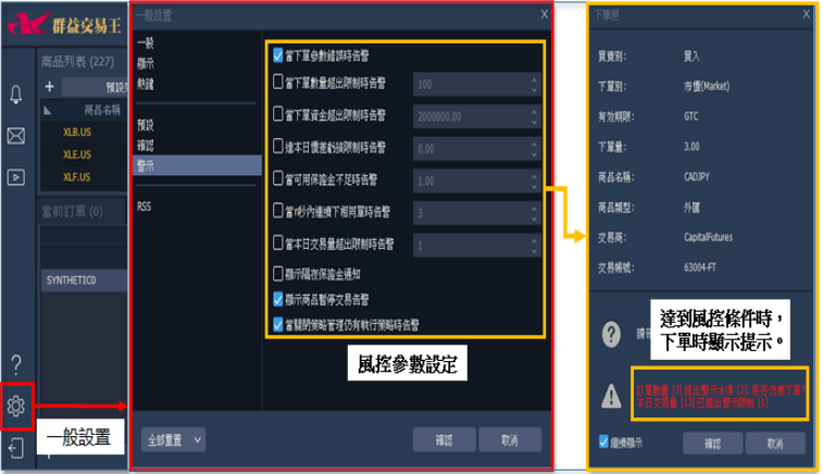 7. 風險提示:平台風控機制除了到價提示功能外,右上方設置中亦有針對下單數、權益數、保 證金用量等提示通知。開啟路徑位於平台畫面右上方設定內之警示,在設定完項目並開啟後, 在達到條件時,